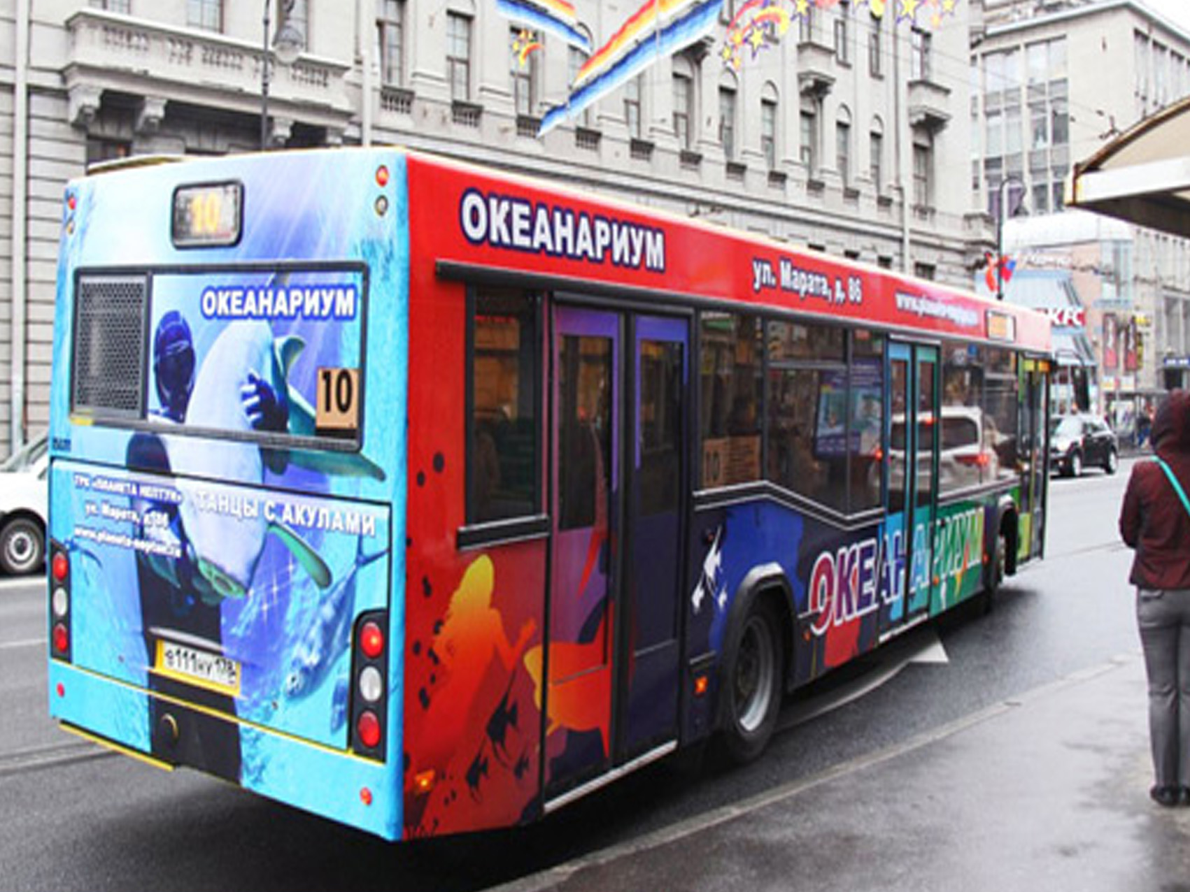Реклама на/в автобусах – это рекламное объявление, размещенное как внутри салона автобуса (листовки, постеры, мониторы), так и снаружи (оклейка дверей, бортов, заднего стекла, полностью кузова транспортного средства), сообщающее пассажирам, прохожим, а также водителям частных авто информацию о предлагаемых товарах, услугах и местах их приобретения.