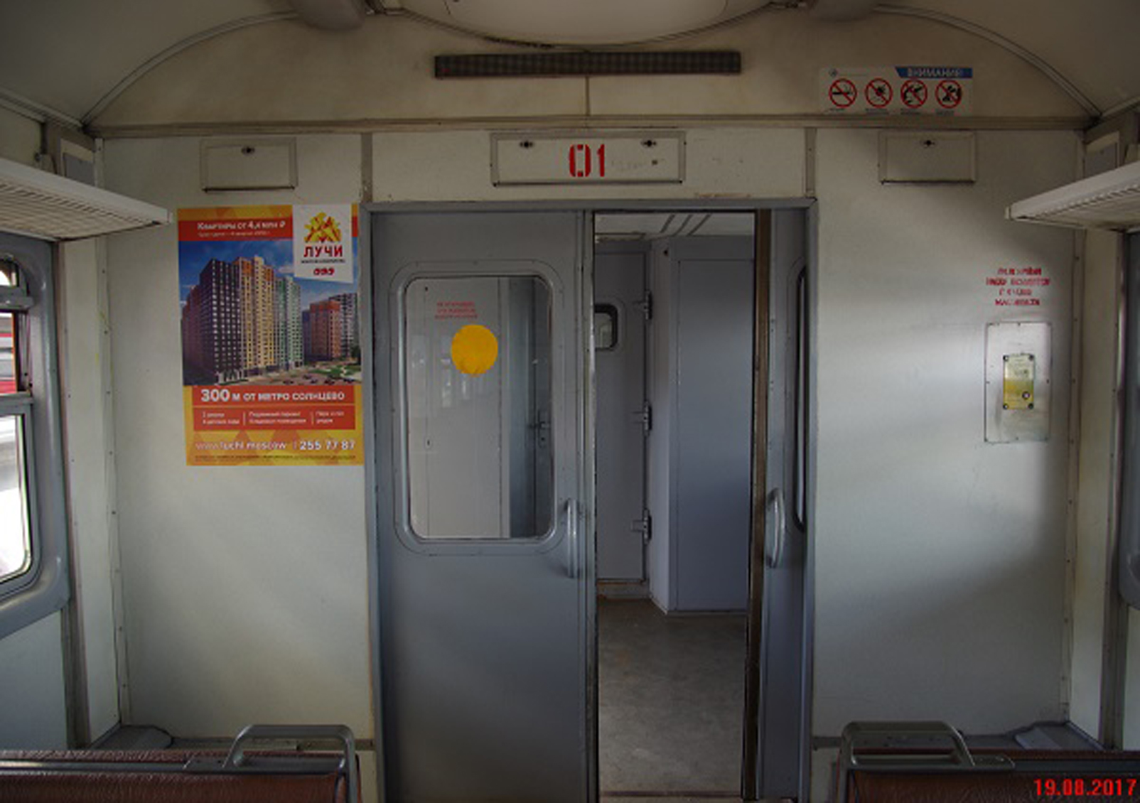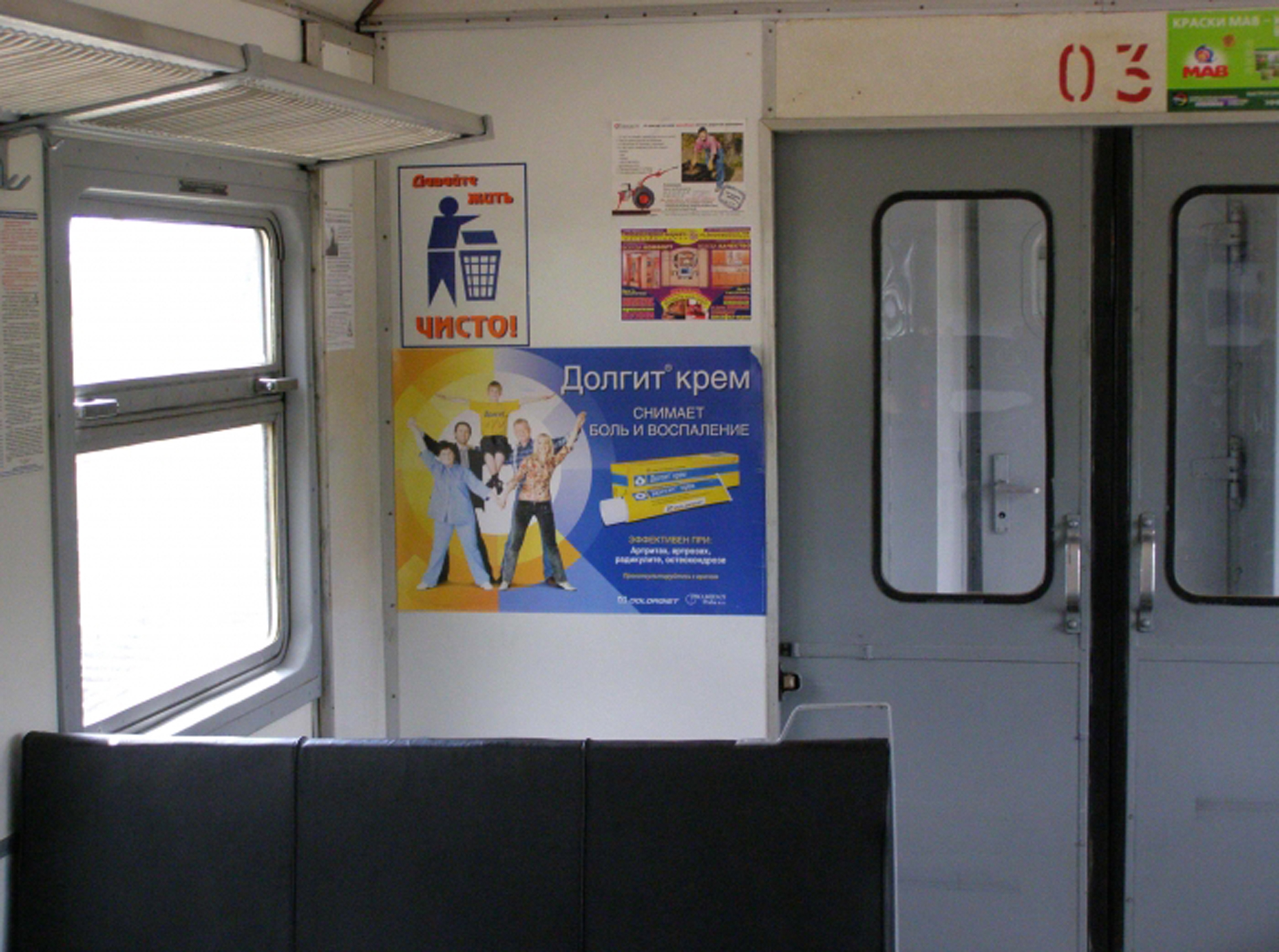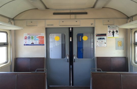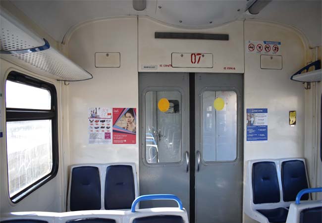 Рекламные стикеры в вагонах электрички на фото выше