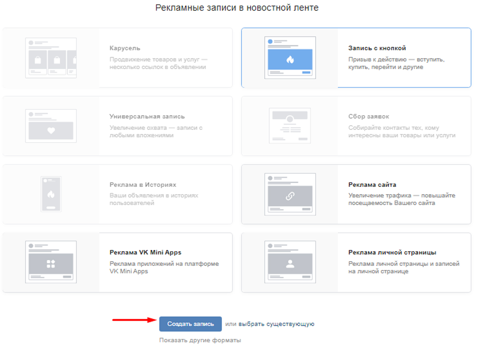 Если ранее вы уже размещали рекламу, то можете выбрать существующий рекламный формат.