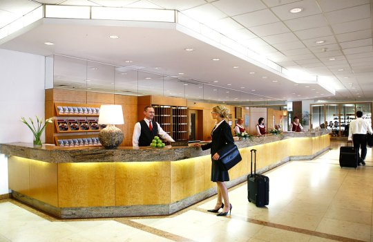 Пример брендирования входа и зоны ресепшн в гостиницах:
