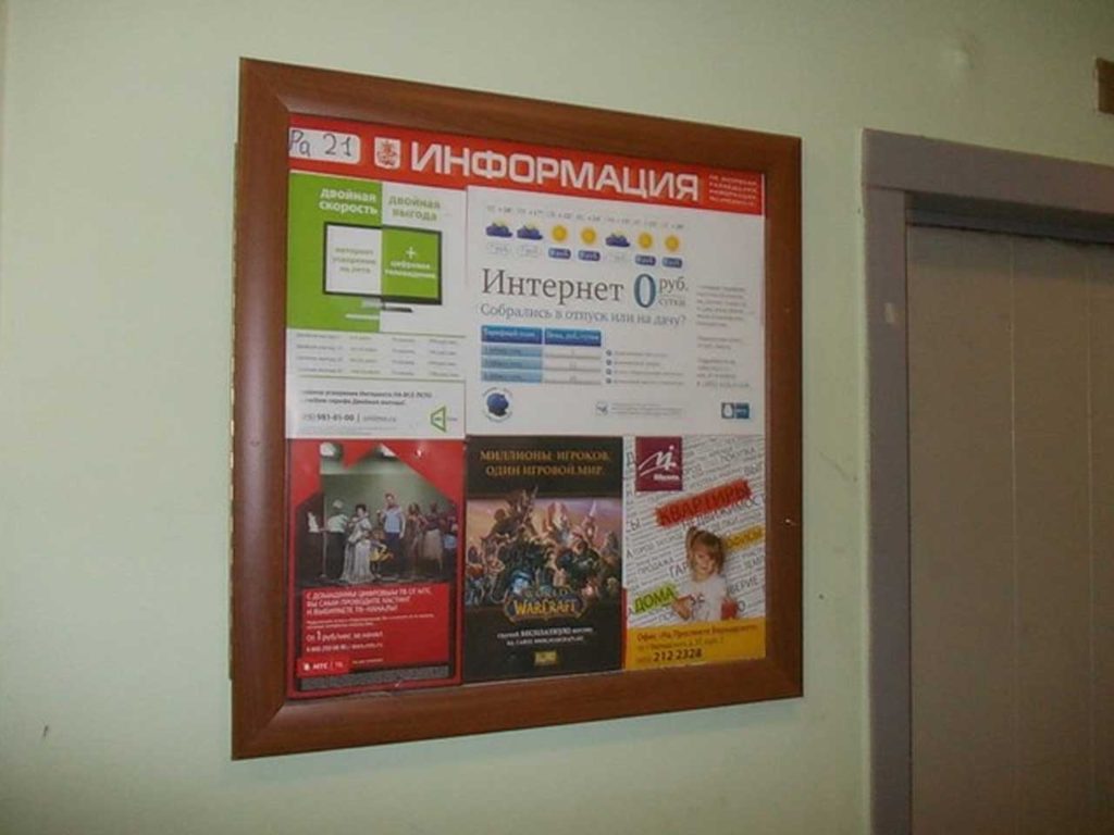 Реклама в подъездах отличается тем, что рекламные материалы располагаются на уровне глаз потенциального клиента или покупателя. Удачное расположение рекламы приводит к тому, что листовки, буклеты и другие форматы рекламы в подъездах хорошо видны и обеспечивают 100% читаемость со стороны жильцов дома.