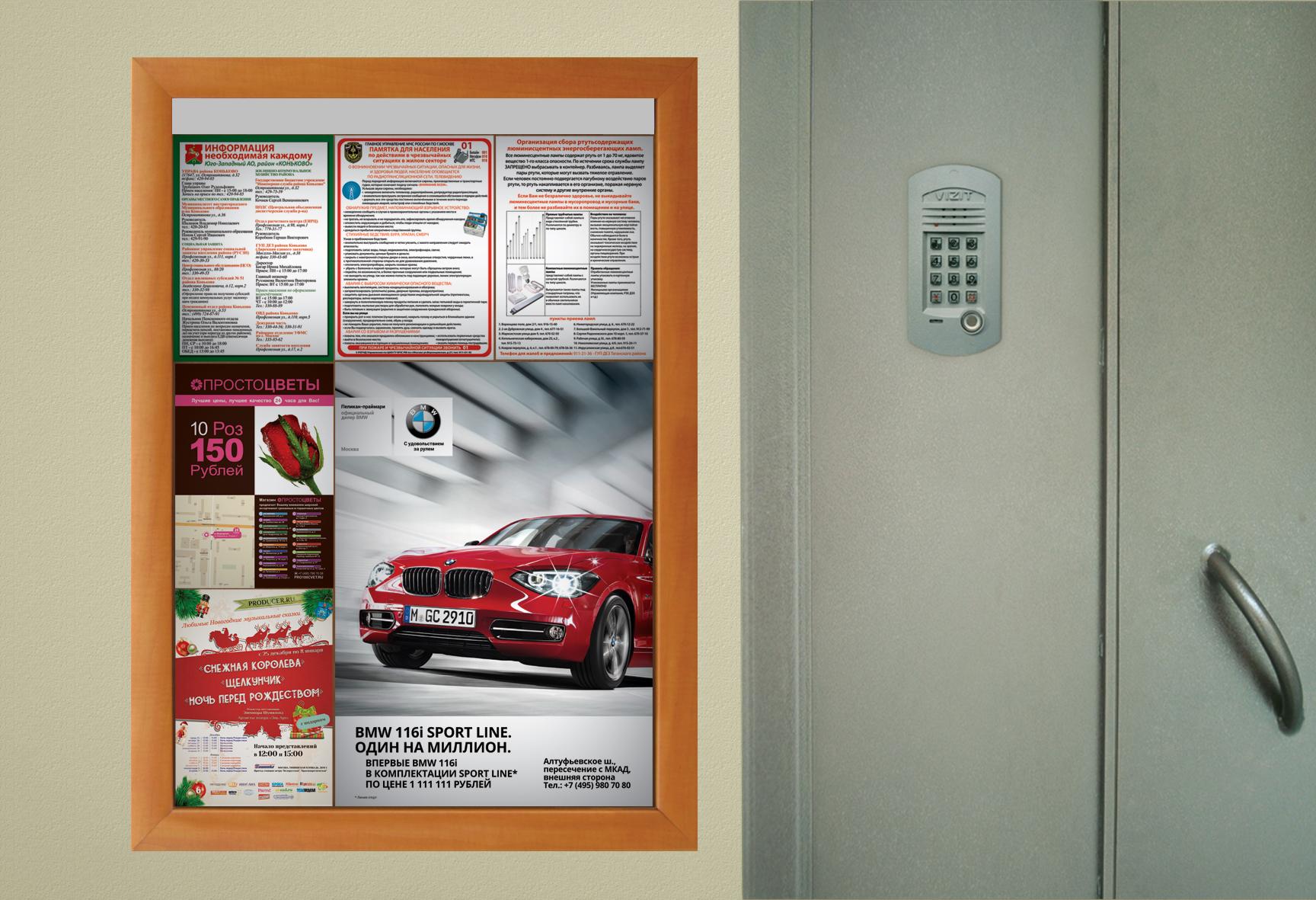 Пример рекламы на информационном стенде в подъезде: