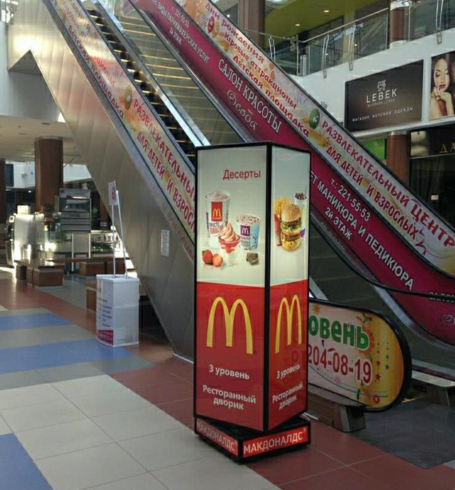 Размещая рекламу в торговых центрах, вы сможете мгновенно охватить всех людей без исключения. Обратите внимание на крупные бренды, такие как Макдоналдс, KFC, Леруа Мерлен, Ашан и другие, понимающие, что прибыльность бизнеса зависит, в том числе и от того, насколько быстро потенциальный покупатель, клиент или заказчик увидит размещенную рекламу. Рекламные конструкции, установленные в торговых центрах, подходят для этого как нельзя лучше.